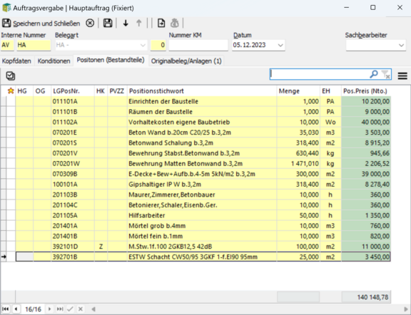 In den Belegen Hauptauftrag, Zusatzangebot und Vertragsanpassung werden im Register Positionen (Bestandteile) die im jeweiligen Auftrag enthaltenen Positionen mit Menge und dem Positionspreis angezeigt.